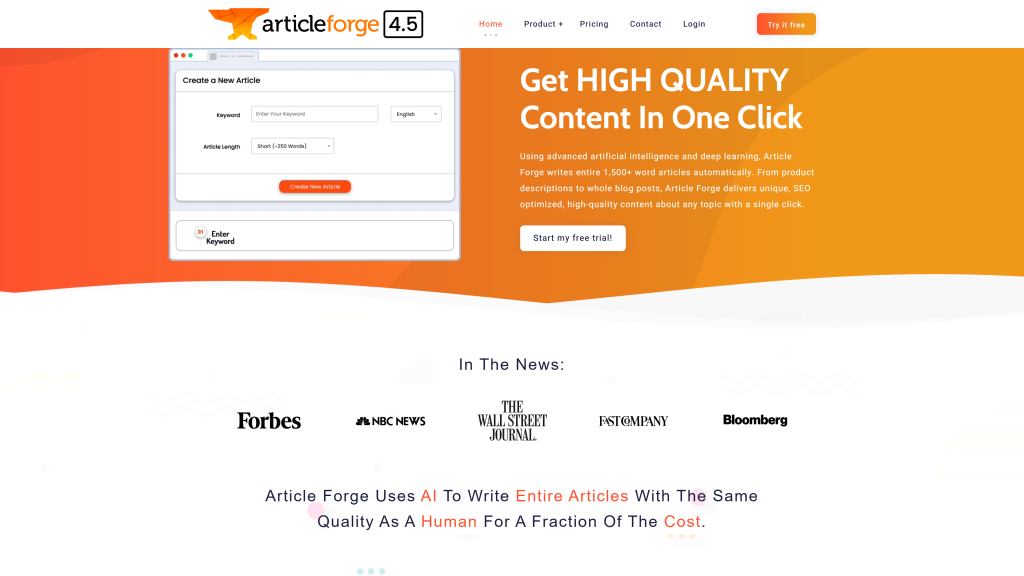 Article Forge is a powerful content generator that helps you create SEO content. It markets itself as a ‘true SEO automation’ tool.